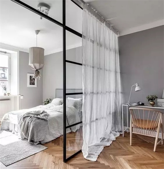 钛镁铝金的隔断门这两年非常火,黑色的铝金边框加上通透的玻璃,很好的做了阻断和通透空间的效果。用在卧室和客厅之间绝对不会出错,如果觉得太亮,在卧室内加一圈窗帘就可以很好的遮光啦!